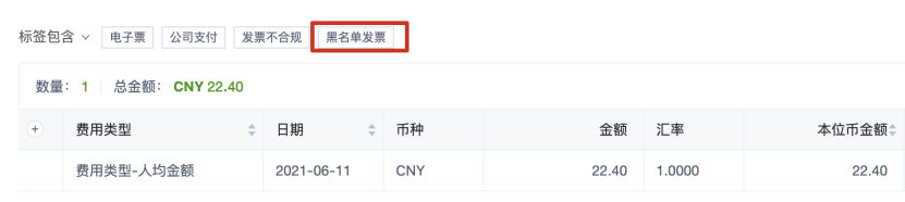 发票新建费用时会校验国税黑名单及自定义黑名单,并提示“黑名单发票”。