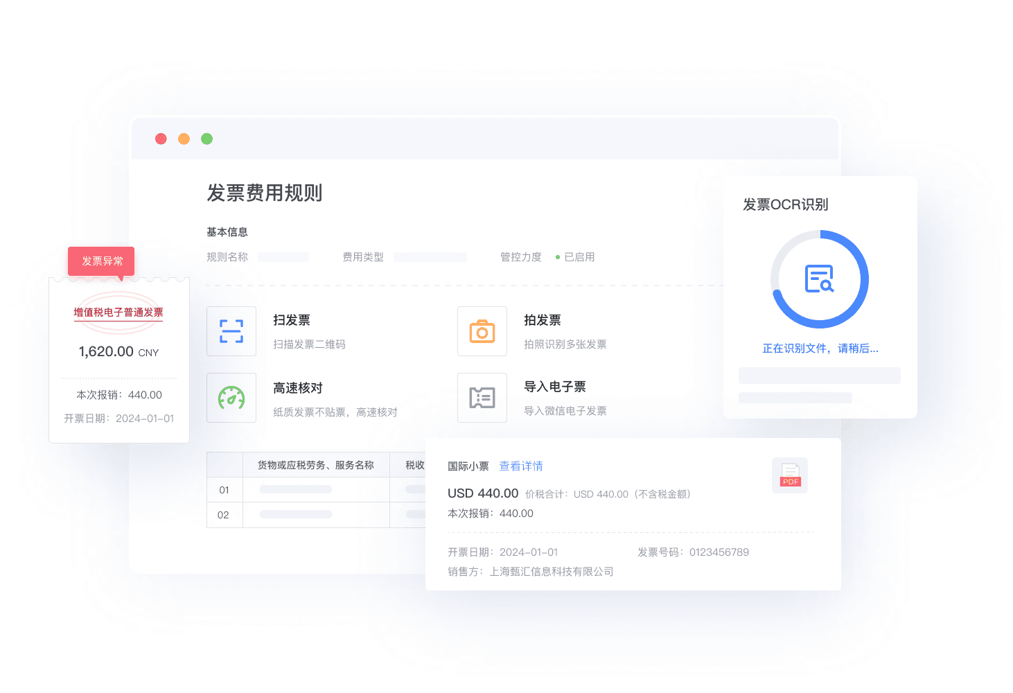 - 汇联易利用移动端以及税局接口,实现了发票的全渠道收集,包括纸质发票OCR识别以及各通道数电发票、电子发票收集;